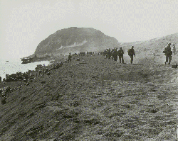 WWII Marines on the landing beaches of Iwo Jima, Mt. Surabachi in the backgound.
