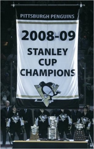The banner, with black letters against a white backdrop with Vegas gold trim, simply reads: "Pittsburgh Penguins. 2008-09 Stanley Cup Champions," and it's adorned with their skating Penguin logo. It soon will accompany the pair marking their back-to-back championships in 1990-91 and 1991-92.