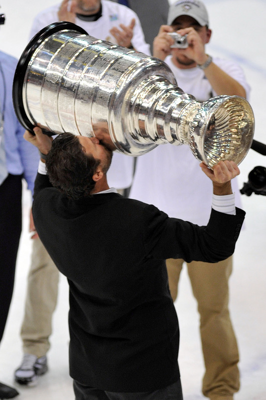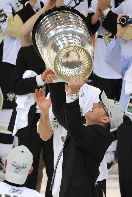 DETROIT - JUNE 12: Head coach Dan Bylsma of the Pittsburgh Penguins celebrates with the Stanley Cup after defeating the Detroit Red Wings by a score of 2-1 to win Game Seven and the 2009 NHL Stanley Cup Finals at Joe Louis Arena on June 12, 2009 in Detroit, Michigan. (Photo by Harry How/Getty Images)