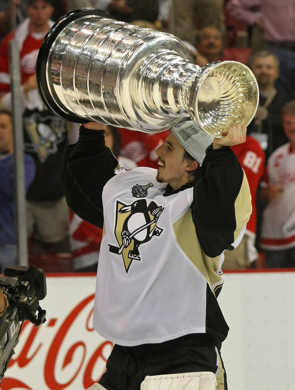 DETROIT - JUNE 12: Goaltender Marc-Andre Fleury #29 of the Pittsburgh Penguins celebrates with the Stanley Cup after defeating the Detroit Red Wings by a score of 2-1 to win Game Seven and the 2009 NHL Stanley Cup Finals at Joe Louis Arena on June 12, 2009 in Detroit, Michigan. (Photo by Bruce Bennett/Getty Images)