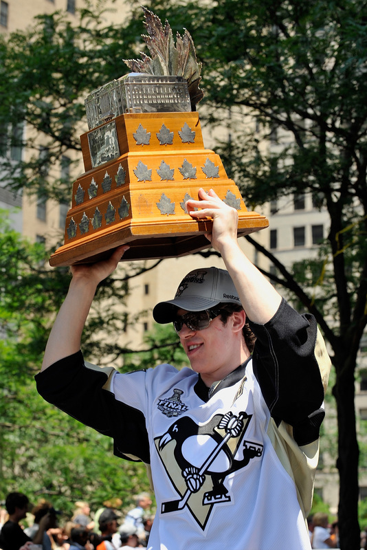 Pittsburgh Penguins’ captain Sidney Crosby lifts the Stanley Cup as streamers fly along the victory parade route in Pittsburgh, Monday, June 15, 2009. The Penguins defeated the Detroit Red Wings, 2-1 in game 7, Saturday in Detroit. (AP)