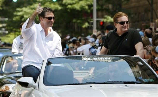 Pittsburgh Penguins co-owners Mario Lemieux, left, and Ron Burkle celebrate winning the Stanley Cup hockey championship with fans as they move along the victory parade route in Pittsburgh, Monday, June 15, 2009. The Penguins defeated the Detroit Red Wings, 2-1 in game 7, Saturday in Detroit.