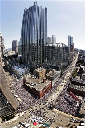 Pittsburgh Penguins’ fans fans line the Boulevard of the Allies in downtown Pittsburgh during for a parade celebrating the Penguins Stanley Cup win Monday, June 15, 2009. (AP)