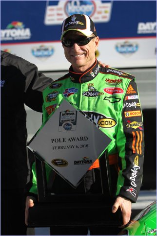 DAYTONA BEACH, FL - FEBRUARY 06: Mark Martin, driver of the #5 GoDaddy.com Chevrolet poses after qualifying on the pole position for the Daytona 500 at Daytona International Speedway on February 6, 2010 in Daytona Beach, Florida. (Photo by Nick Laham/Getty Images)