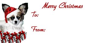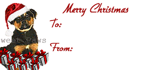 The dog Christmas gift tags are 1" x 2 5/8" inchs with rounded corners. Sold blank. If you perfer to have names put on them it will be $.50 extra per set and will be printed in Handscript. Sold as sets of 120 gift tags, 4 sheets (30 tags per sheet) regular price $8.00 (Now $6.95 per set)plus shipping charge. Standard shipping is $3.50 per set and just $1.50 more for each additional set.