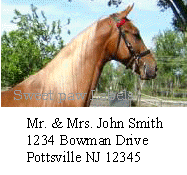Themed pet address labels, many to pick from. Affordable labels with your favorite horse. Horses playing and running, printed on labels. The horse address labels are almost square, 1 1/4" x 1 5/8" in size, 32 labels per sheet with rounded corners. Customize by picking each image per sheet. Three line address is standard. They will be printed in black. We have two Fonts (print) to pick from. Sold as sets of 128 address labels per set (4 sheets)for $8.50 (Now $7.50)plus shipping is $3.00 per set and just $1.50 more for each additional set.