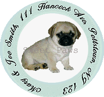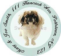 The round dog address labels are self stick, easy peel off 1 3/8 inchs diamiter in size, 30 labels per sheet. Sold as 120 label set, 4 sheets. We will print them in black in "Hancock" type or font as shown. If you have a favorite font, please let us know. The price is $12.00 (Now $9.00) per set plus shipping charge. Standard shipping is $3.00 per set and $1.00 for each additional set.