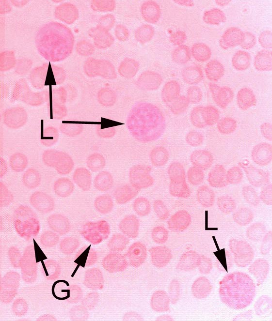 Chronic Granulocytic Leukemia is also known as Chronic Myelogenous Leukemia (CML) and is a neoplastic disease characterized by abnormal, excessive, unrestrained overgrowth of granulocytes (G) in the bone marrow. CML is associated with a chromosome abnormality (Philadelphias chromosome) that is either acquired or induced. This may also affect the agranulocytes (L, lymphocytes). CML develops very gradually as the abnormal lymphocytes multiply slowly, but in a poorly regulated manner. The lymphocytes also live much longer and accumulate in the body. The number of lymphocytes in the blood often rises to be 20-40 times the normal level. The cells appear to be normal but do not function as normal cells. Granulocytes (G) are usually sparsely seen in normal blood. There is generally one granulocyte for every 1,000 erythrocytes. However, in CML as shown above, there is an abundance of granulocytic white blood cells. Lymphocytes (L) are seen even more rarely in normal blood; generally having one lymphocyte for every 40,000 erythrocytes. But as seen above in CML, there is also an abundance of these white blood cells.