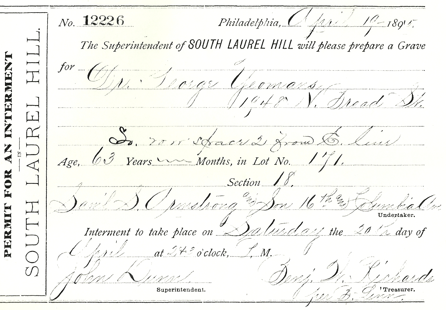 | Burial Information for Dr. George W. Yoemans 23rd Pennsylvania Volunteers, Regimental Surgeon. He was Mustered in on August 30th 1862 and Discharged on a surgeons Certificate on March 13th 1863.He died on April 17th 1895 in Philadelphia. He is buried at Laurel Hill Cemetery in Philadelphia in Section 18, Lot 171, Grave 1.