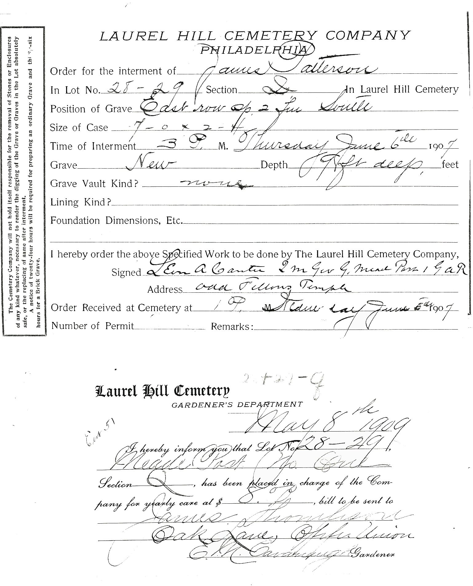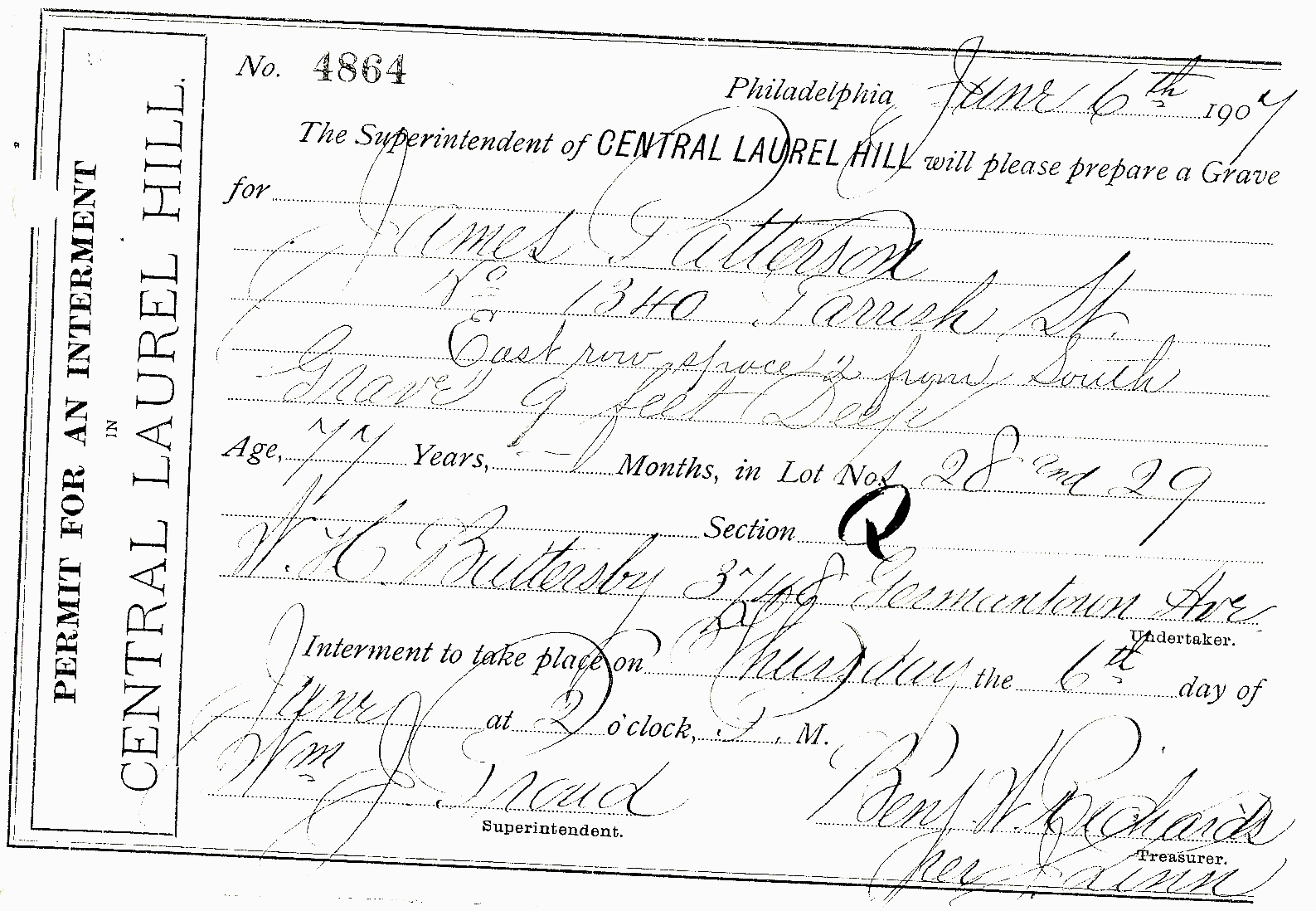 | Burial Information for Pvt. James Patterson , Company A, 23rd Pennsylvania Volunteers. He was mustered into service on February 20th 1862. james Served three years and was transfered to the 82nd PA Volunteers before being mustered out on February 20th 1865. He is Buried at Laurel Hill Cemetery, Philadelphia, in Section Q, Lot 28-29, Eastside.