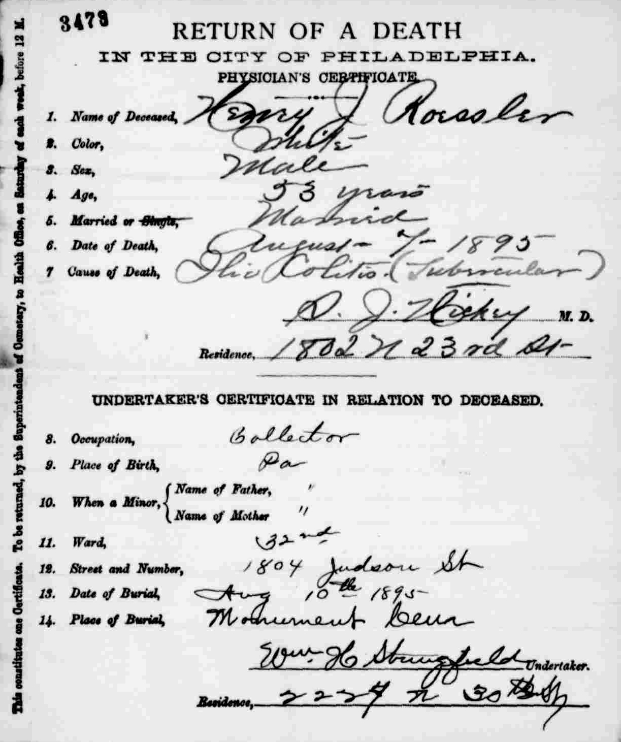 | Death Certificate for Pvt. Henry J Roessler , Company B, 23rd Pennsylvania Volunteers. August 7th 1895, at the Age of 53.