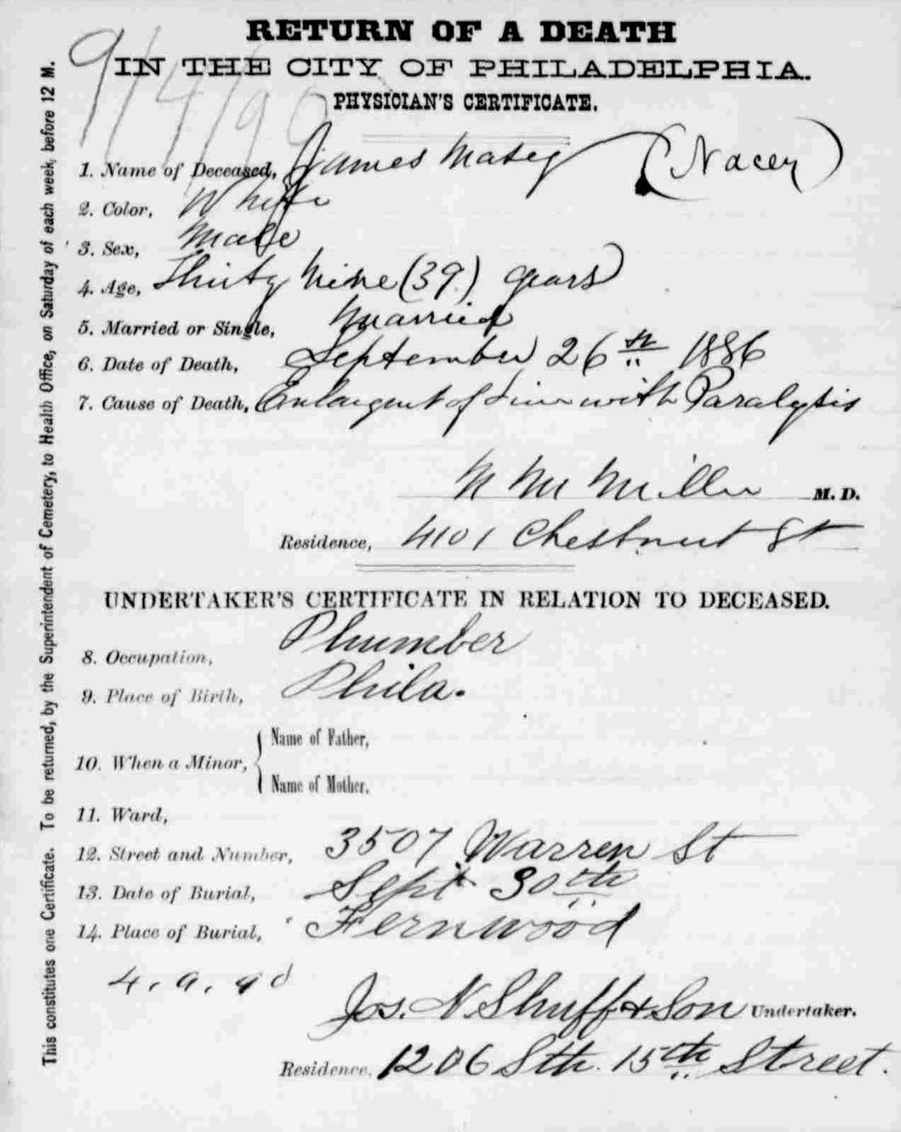 | Death Certificate for Pvt. James Nacey , Company G , 23rd Pennsylvania Volunteers. Died September 26th 1886 at the age of 39.