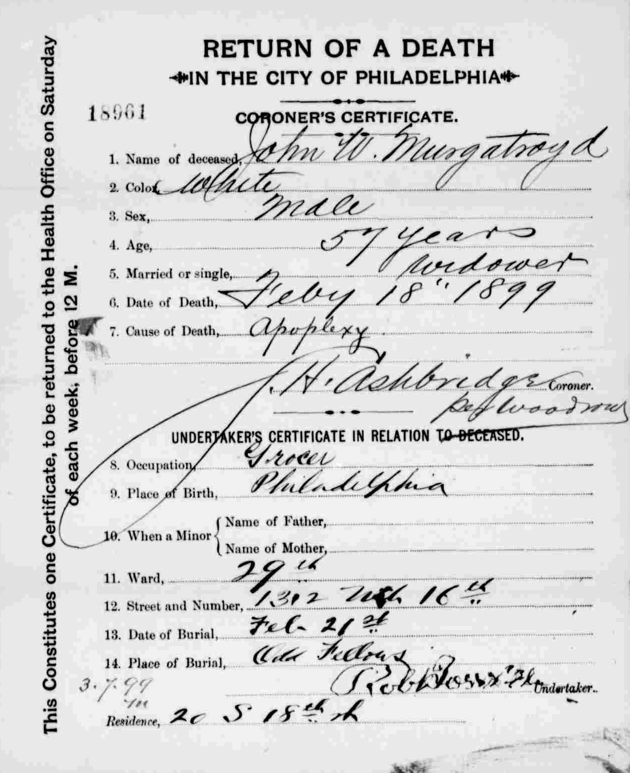 | Death Certificate for Private John W. Murgatroyd , 23rd Pennsylvania Volunteers, Company K. He Died on February 18th 1899 at the Age of 57.