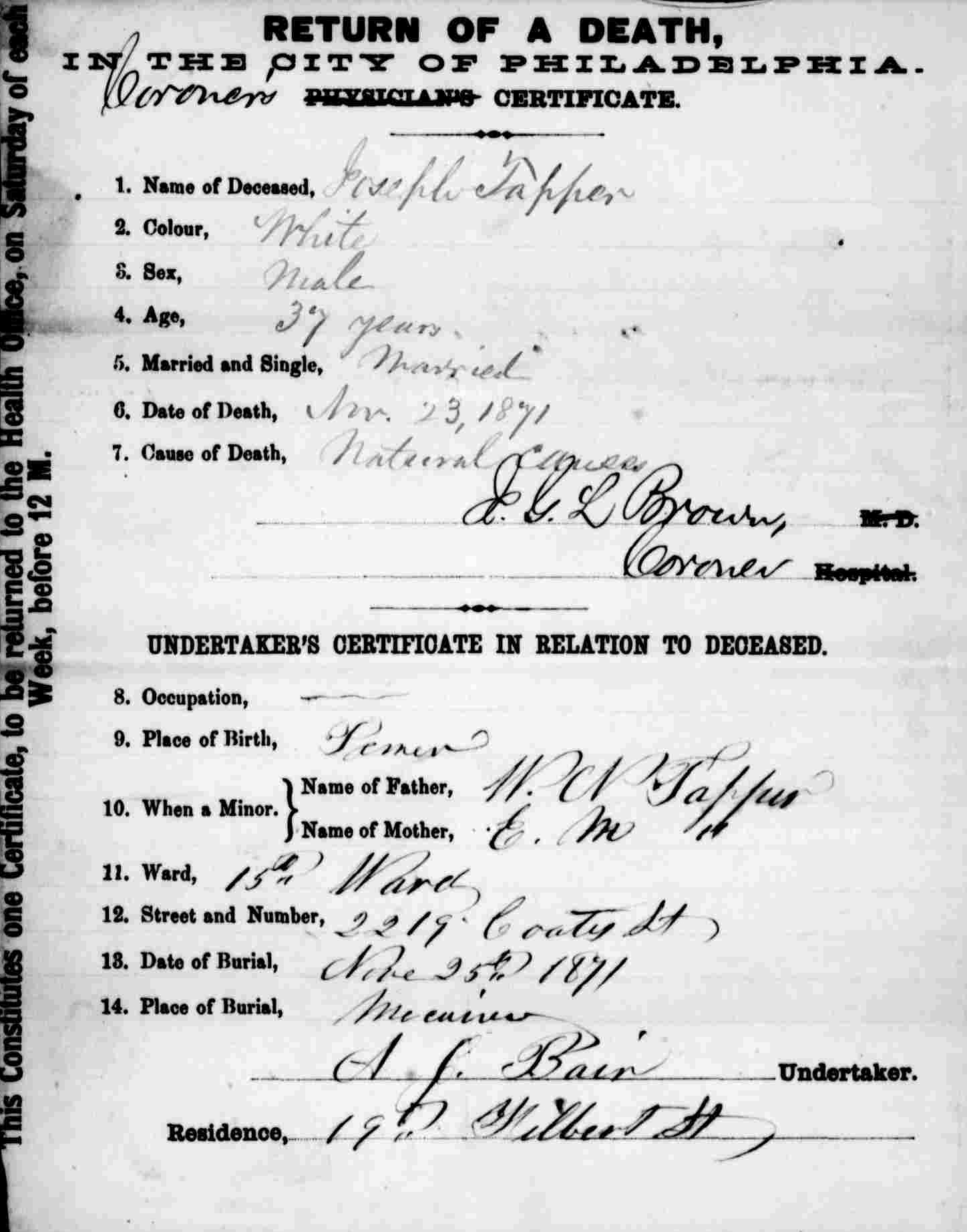 | Death Certificate for Pvt. Joseph Tapper , Company D, 23rd Pennsylvania Volunteers. Died November 23rd 1871 at the Age of 37.