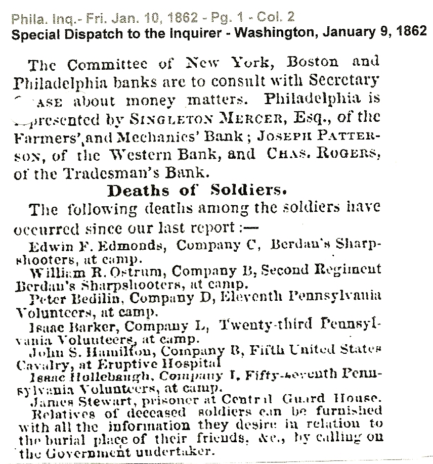 From The Philadelphia Inquirer, January 10th 1862. The Death of Isaac Baker at Camp Graham.