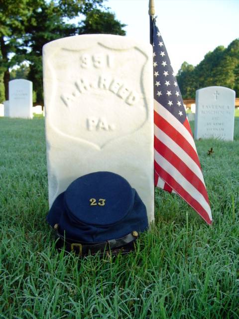 | Grave of Pvt. Abner H. Reed of Company I, 23rd Pennsylvania. He was drafted on August 10th 1863. He was killed at The Battle of Cold Harbor on June 1st 1864. He is buried at Cold Harbor National Cemetery.