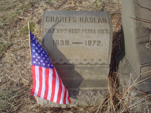| Grave of Pvt. Charles Haslam of Company F , 23d PV. Charles was born in 1839. He was 22 years old when he enlised on August 2nd 1861. During his service he was mustered out by Special Order to reenlist as a US Hospital Steward. Charles died in Philadelphia in 1872 at the age of 33. He is buried at Mt. Moriah Cemetery in Philadelphia.