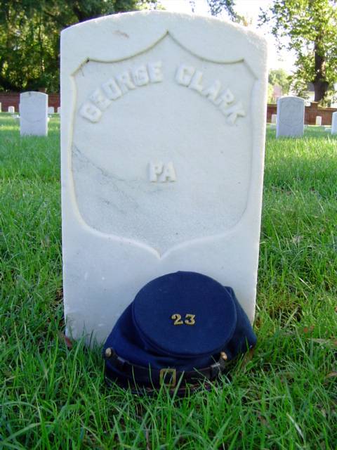 | The Grave of Pvt. George Clark of Company E, 23rd PVI. He was mustered in on August 14th 1861. He was killed at the Battle of Fair Oaks on May 31st 1862. He is buried at Seven Pines National Cemetery. |