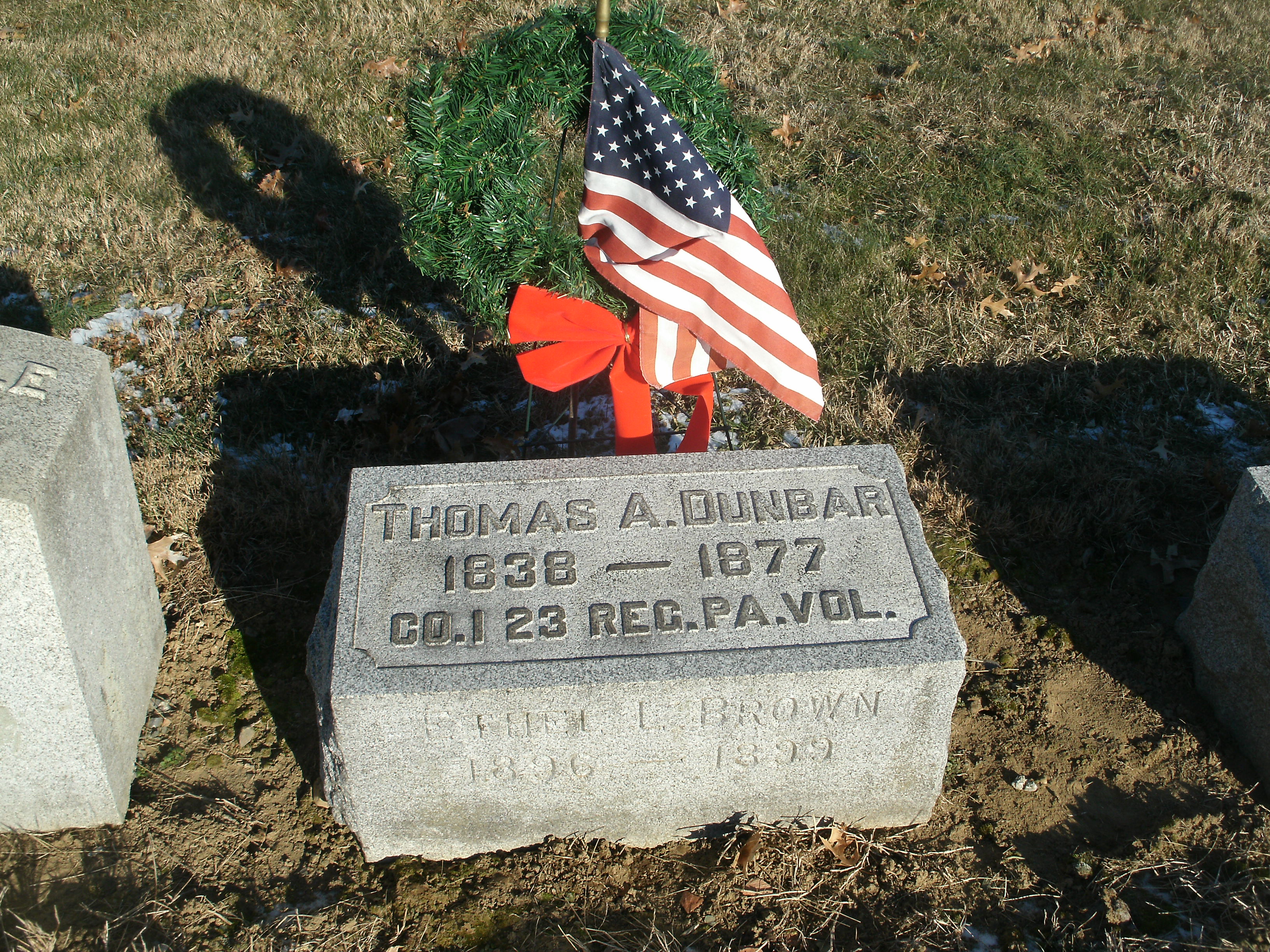 | This is the Grave of Private Thomas A. Dunbar Company I , 23rd Pennsylvania Volunteers, also known by their nickname, “Birney’s Zouaves”. He was born in Columbia,PA in 1838. He was the son of Thomas B. and Elizebeth Dunbar. In 1860 just prior to the Civil War he was employed as a Mason and living in Columbia. After being recruited at a local recruiting station in Columbia, he made his way to Philadelphia where he was mustered in at the Schuykill Arsenal on September 4th 1861. His younger brother, Robert S. Dunbar was also in the Same Regiment and Company. On September 8th 1861, he moved with the Regiment to Washington D.C, where he was encamped just three miles north of the Capitol on “The Queen’s Farm” at Camp Graham . He was there with the Regiment during the cold winter months and in December of 1861; Typhoid Fever broke out within the Camp which resulted in the Death of Fifty-One men of the 23rd Pennsylvania Volunteers. It was decided on March 12th 1862 to move the camp to higher ground in Bladensburg, Maryland to rid the epidemic and ready the Soldiers for campaign. The 23rd Pennsylvania moved to Bladensburg and were encamped at Camp Clark . He was mustered out of Service on September 8th 1864 after the completion of his three year term. After the War, He returned to Columbia.He was married to Sarah Jane Bennet Dunbar, widow of Thomas Bennett of the 5th PA reserves (34th PA), who was mortally wounded at the Battle of south Mountain on September 12th 1862 and died sixteen days later. Thomas Dunbar died in Columbia on May 29th 1877 at the age of 39. He is buried at Mt. Bethel Cemetery in Columbia in Section B.