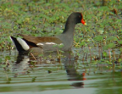 We paddled through the vegetation under the trail bridge and headed east to a little swamp. We took pictures of common moor hens, which often would let us approach very closely before they did their run across the water to gain speed to fly. We also saw anhingas, little blue herons, eastern kingbirds, snowy egrets, and prothronotary warblers. Alligators were bellowing to each other, sounding like large bullfrogs. The sky was going from a light overcast to a blue sky with lots of fluffy clouds. The trees were wearing brand new leaves in colors from yellow green to very dark green and the water plants added their bright green beauty to the picture. We paddled slowly and quietly through the swamp until we ran out of open water, then paddled back along the north side of the lake until we found an opening to a sort of sub lake/swamp. This area was still real open but had more cypress tress than were in the main lake. We paddled though here, enjoying coots, moorhens and an occasional alligator. After about two and a half hours, Natalie had to leave but we kept on going on a slough through a swamp mixed with dry land. We stopped often and found spiders, flowers, and birds as well as beautiful scenery for Debbie to photograph. She finally got both a northern parula and a prothronotary warbler to pose for her. |