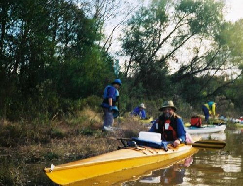 We went on down the river and soon came to a T-shaped split. The fastest current was to the right but the widest water was to the left. The right was filled with obstructions. When Ron, Janet, and Rick caught up with us, Ron said to go left. So we did. We found the river had split around an island. Ron said, "Marilyn, you and I should have gone right". We had already talked about how we like to paddle moving water. But with the extra inertia from the load we were carrying we both might have had problems. Ron had built his own kayak and loves it for a flat water tourer but decided it needed to have a little more rocker to be fun on moving water. The bridge came in sight only a turn or two past the place where the right channel rejoined the river. Janet yelled "There's the bridge. We're saved". It was 11:50 A.M.. Thanks to the fast water, we didn't have to come off at 3 or 4 P.M.. as I first thought we would. We came though the pillars and turned right to the boat launch and quickly got our boats out of the way of guy loading up his motor boat. Then I loaded up the other 4 drivers into my Ford Focus and we did a short run back to our cars. We got back and got everything loaded up, hugged good bye and left to go back to the Dallas-Fort Worth Area, Hammond, LA, and the Houston area. |