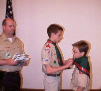 Troop 373 Scout gives a new neckerchief to an AOL Scout