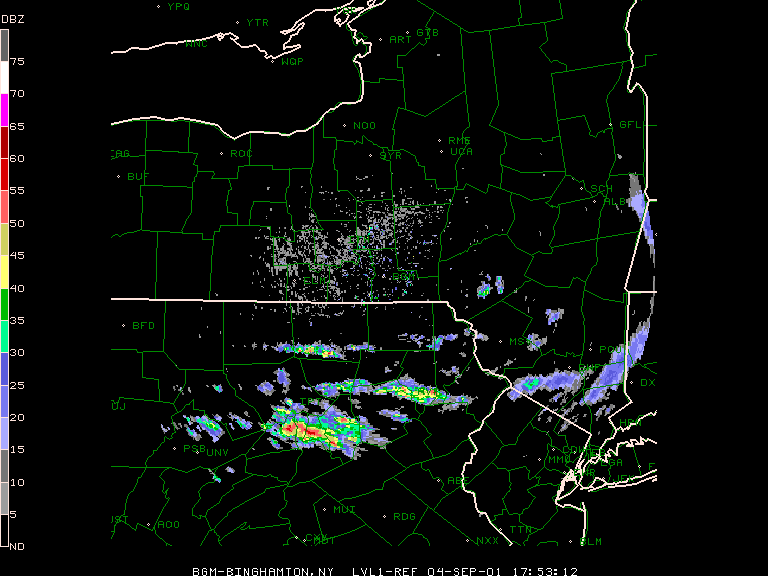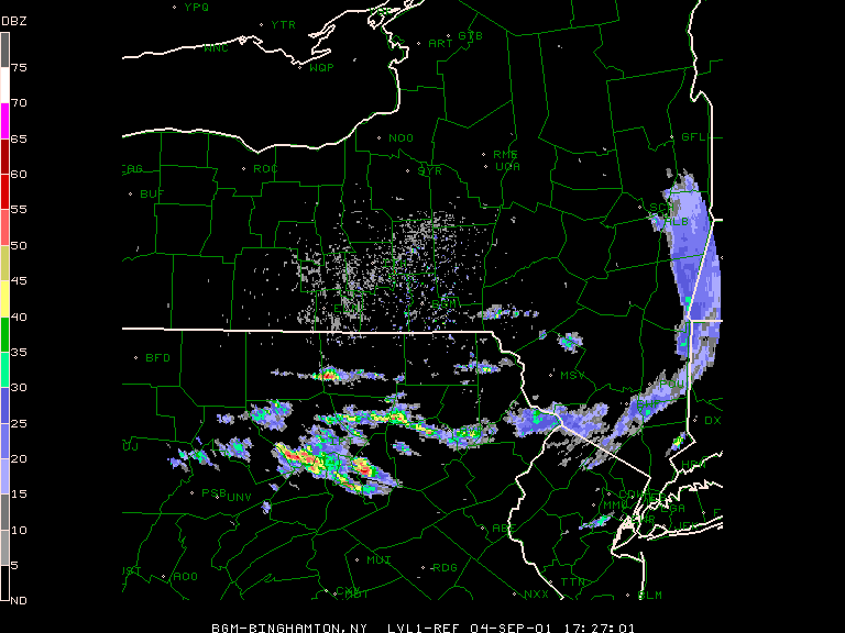 Long Track Severe Thunderstorm - Union County Damage, September 4, 2001A). -- Synoptic Scale & Atmospheric EvaluationDuring the morning, afternoon, and into the evening hours a NE-SW oriented cold front moved across Pennsylvania, triggering scattered showers and thunderstorms. An old outflow boundry ahead the front also aided in convective development, and actually appears that it was likely responsible for the first and severe wave of convection. Middle and upper air wind speeds were fairly strong (though nothing impressive), and mostly unidirectional averaging from the west. See the morning 12Z soundings from KPIT, KIAD, and KBUF. The surface cold front just crossed over the BUF area as is evident in the low level winds (per sounding) having veered to the northwest... and the 12Z surface chart. The vertical speed shear was forecast to, and ultimately did, create a favorable environment for isolated thunderstorms to become severe, and sustain themselves, should they grow deep enough into the atmosphere. One factor that played against a widespread severe weather event was a considerable amount of cloudiness across much of northern and central Pennsylvania during the morning. Areas south of Interstate 80 saw a good deal of sunshine all morning... and the atmosphere became moderately unstable over those locations... with CAPE values up to 1200 J/kg and LI's as low as -5C. Across the whole region ahead of the frontal boundary... KI's were generally at or above 30... and TT's in the 40s, both of which are sufficient to support convection. Atmospheric moisture was also available... with dew points in the upper 60s to low 70s... and precipitable water between 1 and 1.5". The ETA model forecast this well overall, with the 1000mb panel for 18Z showing upper 60s/low 70s dew points surging northward across PA (the solid orange line, known as an isodrosotherm, represents dew points at or above 69F). Mid level energy, positive vorticity, was forecast well by the ETA model at 18Z. Convective activity typically occurs along/just ahead of the forward section of the PV area... in this case the southern section. And that matches well with observed conditions. A big factor that played against a solid line of violent thunderstorms with damaging winds was the lack of significant synoptic scale forcing along the frontal boundary. Also low level speed shear was not significant across PA and areas south and east. In addition, while mid-upper level winds were strong... they certainly could have been much stronger. South of New York State... across PA/NJ during the afternoon... speeds reached no higher than 60 knots in the upper levels and were mostly less than 50 knots prior to frontal passage. Across Upstate Western NY... speeds increased significantly aloft (50 knots just above 600mb, 85 knots at 200mb)... however frontal passage occurred during morning, an unfavorable time for convection with not much great snyoptic dynamics in place. Clouds also were widespread across that area... further inhibiting significant convective development. SPC had the region in a slight risk for severe weather from the previous day... see text and graphic. The new day 1 outlook issued by 2 am on the 4th continued the threat (text / graphic). NWS CTP and PHI issued these Severe Weather Outlooks to alert the public of the threat. B). -- Regional Thunderstorm & Radar OverviewA band of scattered showers and thunderstorms increased in intensity ahead of the cold front and with the outflow boundary during the course of morning.... and especially afternoon... across PA. Due to the widespread cloudiness across northern PA and early frontal/outflow boundary passage time... thunderstorms did not become strong until they reached the I-80 corridor and southward. Here, isolated intense thunderstorms formed during the afternoon. SPC issued a severe thunderstorm watch during mid afternoon for about the southeastern 1/4 of PA... from the Lower Susquehanna Valley through the Lehigh Valley and Philadelphia Metro area... northern Delaware... and much of New Jersey. NOTE: UNFORTUNATELY, KCCX RADAR WHICH NORMALLY COVERS THE AREA DISCUSSED BELOW WAS NOT AVAILABLE TO ANYONE OUTSIDE THE NWS OFFICE DUE TO COMMUNICATION PROBLEMS. THUS, RADAR FROM KBGM WILL BE PROVIDED. What would become the most significant thunderstorm of the day in PA formed initially in southwest Lycoming county during early afternoon. However, its origin appears to have started well northwest of there, in NW PA as a towering cumulus and convective shower. Not until near the Clinton/Lycoming county border did it attain thunderstorm status, though. As this thunderstorm moved southeast into Union county... it produced large hail and a wind damage event. At 17:42Z (1:42pm)... you can see the core of this thunderstorm over the Lycoming/Union county borders. The 17:53Z (1:53pm) reflectivity image shows the thunderstorm moving across eastern Union county, the severe part of it having just entered Kelly Township north of Lewisburg. It is just about to produce wind damage in Kelly Twp around 2 miles north of Lewisburg. The reflectivity image from 17:58Z (1:58pm) continues to show the severe thunderstorm... now about to enter Upper Northumberland county south if Milton. Nickel to quarter size hail (.88 - 1") was falling under the core of it. Wind damage began around 1:55pm... and damage is occurring at the time this radar image was taken (1:58pm). 1803Z reflectivity data shows the severe thunderstorm over the Union/Northumberland county border. The most significant winds are dissipating around now. See the directory for this event for numerous radar images after time. Storm Relative Velocity (SRV) data indicated very weak rotation at a very shallow level, only evident on the lowest level radar scan. This was nowhere near the criteria for a tornado warning, and thus a severe thunderstorm warning was issued for the area. The thunderstorm continued to track southeast for a rather long period of t