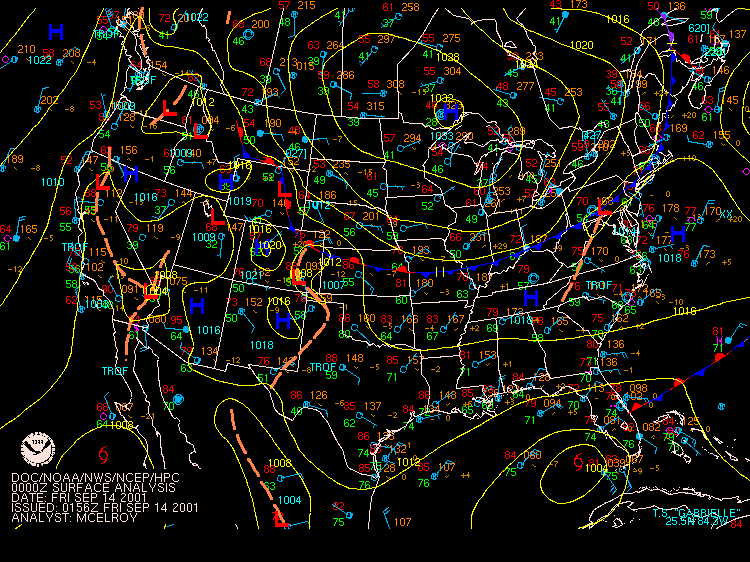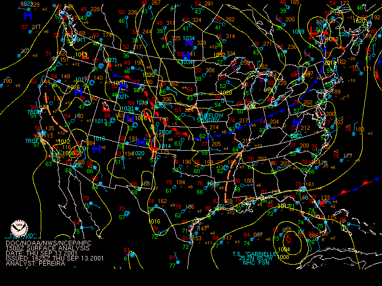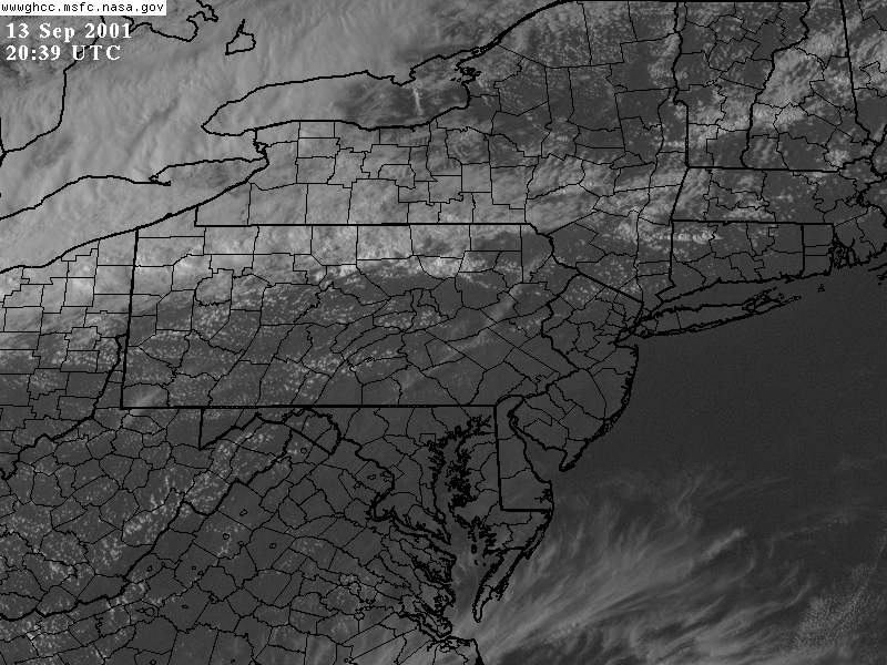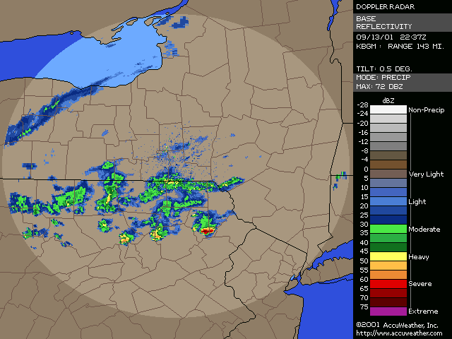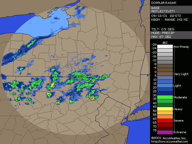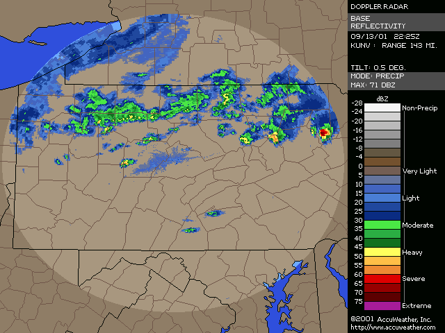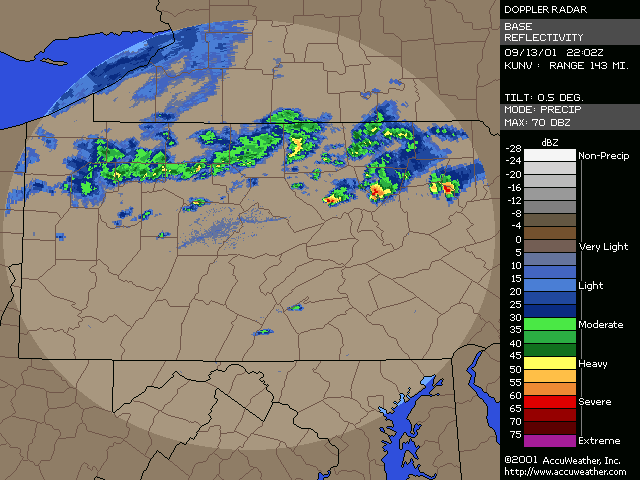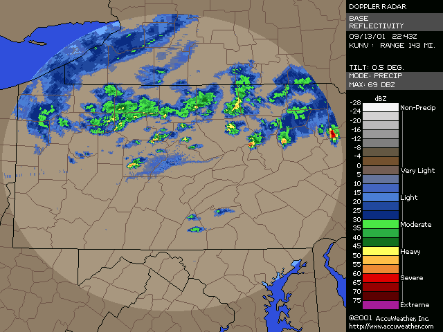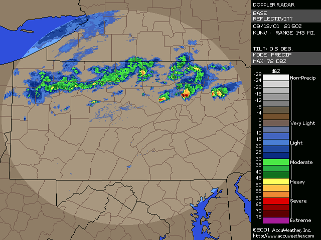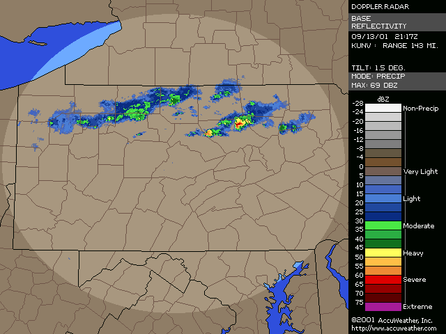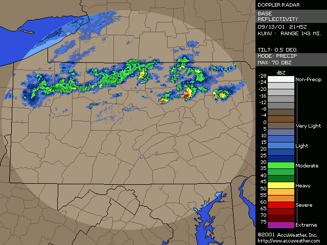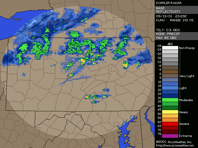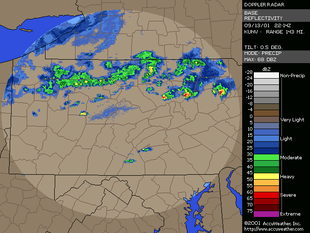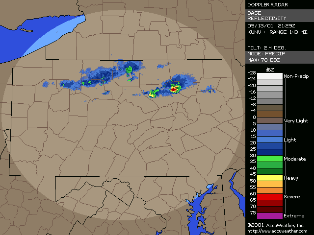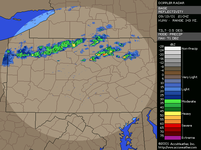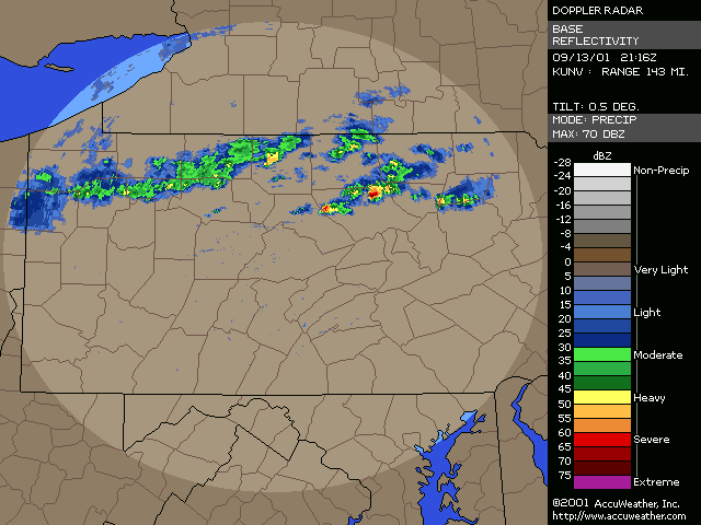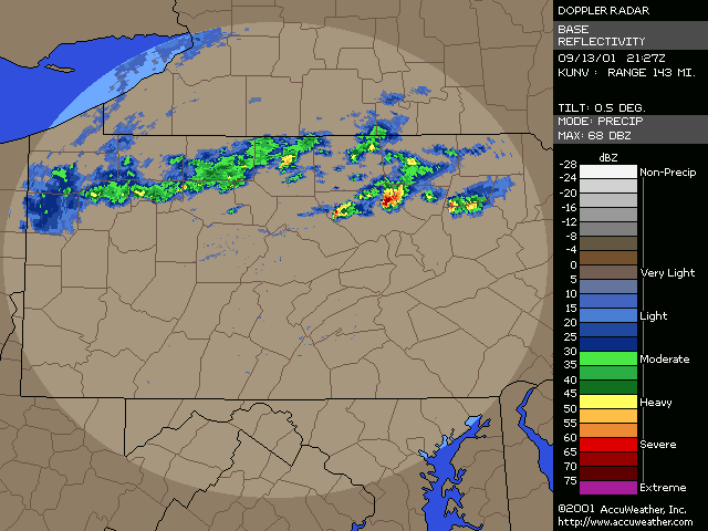 September 13, 2001, Isolated Intense Supercell ThunderstormsA NE-SW oriented cold front with a significant thermal gradient moved across the state through the day... see the 15Z and 00Z surface analysis charts. 850mb temperatures dropped from around 14C ahead of the front... to 2-4C behind it. Several severe thunderstorms formed from late afternoon to mid evening, and became quite intense. Widespread significant convection was not forecast, and did not occur, with one of the largest factors being lack of significant moisture. Surface dew points were generally in the upper 50s to low 60s; see 18Z & 22Z surface dew point contour. Since these maps show isodrosotherms (lines connecting equal dew point) over a wide area, isolated ASOS observations reporting dwpts in the low to mid 60s are not shown in the contour. The AVN and ETA models forecast this well... with the 1000mb panels bringing the 59F isodrosotherm very close to observed conditions... see the 18Z and 00Z 1000mb ETA forecast panel. The NGM did poorly in this respect, keeping low level dew points too low, although this is a bias of the model. Precipitable Water was generally around one inch, give or take from area to area. The convection with this cold front developed, as forecast, along and BEHIND the boundary... unlike the majority of cold fronts which have the convection ahead of them. Models did a good job in showing the forcing behind the front. No moist convection formed before around 19Z (3pm EDT), and models (including commonly used ones such as ETA, NGM, AVN, MESO-ETA) showed a significant increase in forcing, UVV, between the 18Z and 00Z panels. This corresponded well with the time convection would begin to develop, which was mid to late afternoon (>19Z). The airmass remained unstable for several hours after frontal passage... and then the cooler, drier, more stable air moved in. Widespread sunshine occurred through the morning and afternoon hours before the convection developed... as can be seen in the visible satellite imagery... allowing the airmass to destabilze. Models indicated this well... including the locally run MM5 (from NWS CTP)... see the 15 and 18Z cloud forecast panels. Note the lack of synoptic scale clouds indicated in the lower and mid levels, which turned out to be correct. Surface Based CAPE values over a wide area were low... less than 1000 J/kg across the state, per PSU maps. See the 20Z estimated CAPE. LI's were also nothing impressive, dropping mostly to -4, but enough to support thunderstorms given the presence of other favorable conditions. See 20Z estimated surface LI. KI values were generally in the mid and upper 20s during afternoon and evening before the stable airmass moved in. TT's were in the mid-upper 40s. Each of these values support convection but, like the CAPE and LI, are not impressive. The main feature which made several thunderstorms severe was the vertical wind profile. Rather good speed shear moved into the region during afternoon and evening... with the 00Z KPIT observed sounding showing 55 knot winds reached by the 400mb level. Note the pretty good increase in speed below 400mb, from the lower to mid levels. Several of the thunderstorms that formed in PA during the afternoon and evening formed rotation. Note in the 00Z PIT sounding, where the cold front has already passed over, the wind shift in the low levels to the north-northwest... while wind remained westerly through the rest of the atmosphere. The forecast ETA sounding for KIPT (Williamsport, PA) at 18Z, just prior to frontal passage, shows a general westerly unidirectional profile. The 00Z forecast sounding for IPT shows the continued WSW profile above 800mb, but a significant veer in low level wind to the NNW... due to the surface front having passing through. Since the convection formed behind the front... this directional shear, plus the added speed shear profile, was sufficient to cause rotating updrafts within thunderstorms. SPC did not have any of the region in a slight risk... as seen in their day-1 outlook graphic and text. Their probabilistic outlook for damaging convective winds and large hail had the area in the 5% probability, however, which is the lowest percentage given for wind/hail. This event was probably worthy of a slight risk, however, easier seen after the fact. NWS-CTP AFD's mention the possibility of isolated svr wx today, especially the bottom two (2:30pm from the 12th, and 3:35am from the 13th). The first thunderstorms became severe very rapidly during the late afternoon over north-central PA. The 21:04Z (5:04pm) 0.5 degree tilt (tilt 1) reflectivity image shows two severe thunderstorms; one just west of the Lycoming county border in Clinton county... and the other in northern Lycoming county just south of the Tioga county border. Note 71 dbz with the small cell near the Lycoming/Clinton county border. However the storm in northern/northeastern Lycoming county would soon become the most significant storm. The tilt 1 Storm Relative Velocity (SRV) data by 21:11Z clearly showed rotation within that thunderstorm... and a severe thunderstorm warning had been issued several minutes earlier. Radar indicated hail up to 2.25" in diameter, in addition to a mesocyclone. The 21:16Z Echo Tops image shows 43K feet with the storm. Tilt 1 reflectivity shows 70dbz... and tilt 2 even computes 69dbz at that elevation. While tilt 1 SRV data is not impressive now, tilt 2 SRV looking higher into the thunderstorm cell shows significant rotation... with radar Storm Information Table (SIT) indicating 3-D correlated shear/rotation and hail as large as 2.5"! 21:21Z VIL shows 59 KG/M2... which is quite high. Reflectivity tilt 1 at 21:22Z still has very high dbz... 69. While the tilt 1 SRV data shows rotation, the 21:24Z tilt 2 is certainly more notable, and essential in warning for this storm. Radar continues to indicate a mesocyclone and damaging hail up to 2.5" in diameter, with 44Kft echo tops and 58 VIL. 21:27Z reflecti