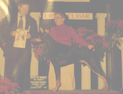 This is Ch Aerowin's Good Vibrations (Kal) The Keeper of my Heart. Kal is pictured here at 11 and a half years old, just a month before he died. Every dog here at Shadeko Dobermans goes back to Kal. He is our foundation dog.
