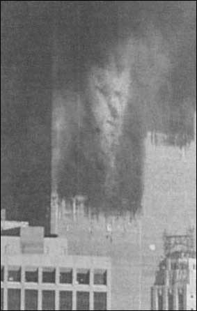 This is a more recent photo taken on Sept 11th from the roof of an apartment bulding in Brooklyn as the second plane hit. It was taken by AP journalist Mark Phillips who maintains that he did not tamper with the photograph in any way. He transmitted it to his AP editor within 40 minutes of the attacks. She has a strict policy that her photographers not alter photos in anyway. People have said that this is the face of a demon. What do you think? |