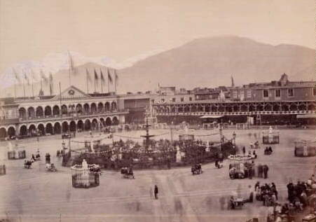 Lima al entrar al siglo XX, (1900). Aun no eran remodelados el Palacio de Gobierno (derecha), ni el Palacio Municipal (izquierda). |