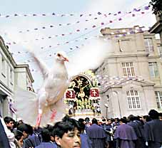 Miles de fieles acompañaron ayer el último recorrido procesional de la imagen del Señor de los Milagros por las calles céntricas de Lima, que incluyó la visita a los hospitales San Bartolomé y Arzobispo Loayza. Previamente al inicio del recorrido el arzobispo de Lima, monseñor Juan Luis Cipriani, celebró a las 7 a.m. una misa en Las Nazarenas. En el cruce de la avenida Alfonso Ugarte y el jirón Sánchez Pinilla, el Club Universitario de Deportes, representado por su presidente y los jugadores del vigente campeón del fútbol peruano, rindieron su homenaje al Cristo Morado con ofrendas florales. |