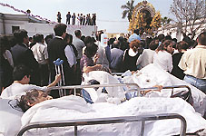 El hospital San Bartolomé, en la avenida Alfonso Ugarte, recibió a la imagen con globos, lluvia de flores, rezos y declamaciones. Luego la procesión cruzó esa avenida y avanzó hacia el hospital Arzobispo Loayza. El ingreso al hospital, como era comprensible, fue restringido. Miembros de la hermandad, así como las cantoras, sahumadoras y los músicos recorrieron el interior del nosocomio. Enfermos, familiares, autoridades, cuerpo médico y personal del nosocomio expresaron su fe al Cristo de Pachacamilla. Una veintena de alfombras de flores testimoniaba al paso del Señor de los Milagros, la devoción que hay en cada uno de los pabellones: rehabilitación, odontoestomatología, nefrología, cardiología, geriatría. Afuera, a lo largo de las cuadras ocho, nueve y diez, cientos de personas aguardaron una hora, aproximadamente, la salida de la imagen del hospital. |