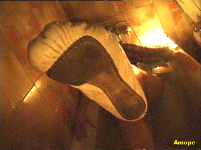 Twelve pictures of a midnight bath at dim candles light. Coffecat's white slippers needed to be washed anyway... The only problem here was to keep the camera lens clear of the usual fog that builds up on a hot bath. She liked the feeling of the warm water flooding her toes inside the slippers and I had to force myself to concentrate on the camera work, before jumping into the bathtub too, what a trip! Her feet tasted so sweet, she had put a little of bath cream in the water.