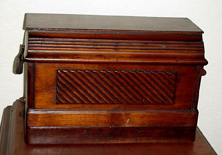 | This is taken from the end with the balance wheel. It shows the beautiful design on the handcrank, too. This picture also shows the storage compartment slightly opened. |