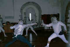 Chris meets his opponent's attack with an advance parry of high tierce.Before riposting to the open line, in this case his attacker's exposed flank.