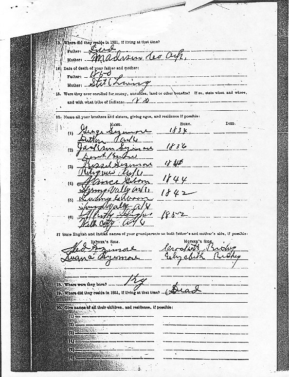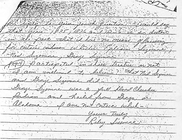Luanah, Russell,and Arry Elizabeth Sizemore were children of Ephraim Sizemore and Naomi(Oma) Ritchie. Ignore the mistake on first ECA where it states Elizabeth Grigsby as Ephraim Sizemore's wife. Riley Sizemore was son of Russell Sizemore. Below, I have included an important part of his application. Ephraim's father was Edward Sizemore, who married Luanah Bohlen/Bolen. Edward was son of George Sizemore and Agnes Shepherd. In 1907 the U.S. government offered to pay the descendants of the Eastern Cherokee for land taken from their ancestors. Well, over 2000 Sizemore and Sizemore related families filled out these applications. They were called ECA's or Eastern Cherokee Claim Forms. In the end, the Sizemore's could not prove their Indian ancestry. But, these applications are priceless. They prove four generation back on my Sizemore line. There are hundreds of these applications available on micro-film.