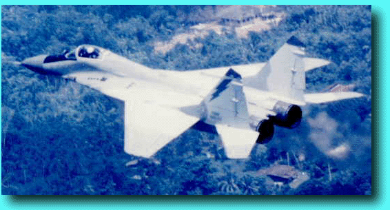 After evaluating several multi-role fighters, including the French Mirage 2000-5, the American F-16 Falcon and F/A-18 Hornet and the Russian Su-27 Flanker and MiG-29 Fulcrum, the Malaysian chose to buy 8 F/A-18D Hornets (described seperately)and 18 MiG-29 Fulcrums. The order was placed on 7 June 1993 for 16 MiG-29SDs, 2 MiG-29UBs and 8 Mil Mi-35M Hind assault helicopters. The Hind order did not materialise but the US$1.6 billion deal for the MiGs continued. The deal coverd the 18 jets, 12 spare RD33 engines, two ground instruction airframes and an armament package consisting of Vympel R-73E (AA-11 Archer) IR-homing air-to-air missiles which ae considered the best of its kind in the world and less deadly R-72R (AA-10 Alamo) which is on par with the American AIM-7 Sparrow missile. The MiG-29N Fulcrum is based on the MiG-29SD varient. These include raising airframe and engine life to 6000 and 4000 hours respectively, installation of Cossor IFF, Collins radio, ARN-138 TACAN, English Language voice-warning system, ILS(Instrument Landing System), GPS(Global Positioning System), additional fuel and English Language instruments calibrated in Imperial units. On 16 October 1997, a US$34.4 million contract to upgrade the MiG-29Ns' N-019ME radar to N-019M Toplaz-M radar was reached. This upgrade would enable the MiG-29N to fire the R-77 (AA-12 Adder) active radar missile, the Russian equivalent to the deadly American AIM-120 AMRAAM and also the Kh-27T airr-to-surface missile. The upgrading should have been completed by mid-1999. An order of 16 more MiGs have been announced but not made due to the economic crisis.