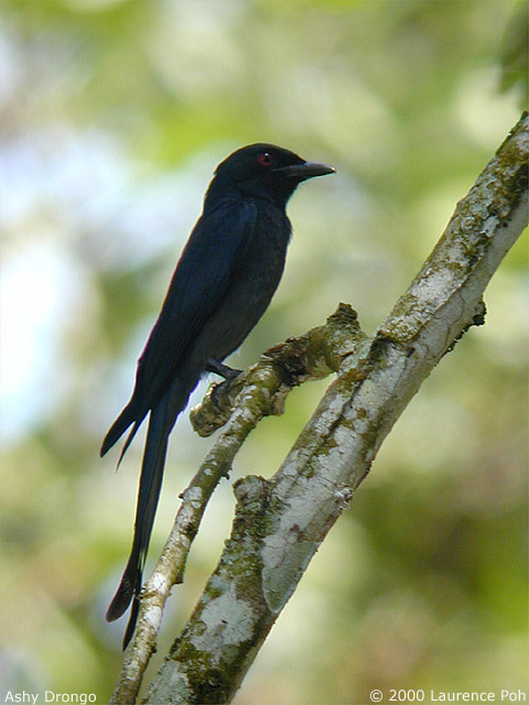 Drongo. Eyes red. Found in deciduous and evergreen forest, forest edge,