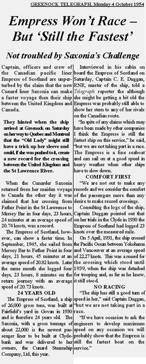 September 1954 saw the maiden voyage of the Cunard liner Saxonia (later Carmania). This was the first of four new 22,000-ton sister ships built specifically for the UK to Canada service. Saxonia made a fast time for the trip, which prompted reported exchanges between officials of Cunard and Canadian Pacific as to which was the faster, Saxonia or Empress of Scotland. In reality there was probably little in it, but the Empress was of course twenty-four years older.