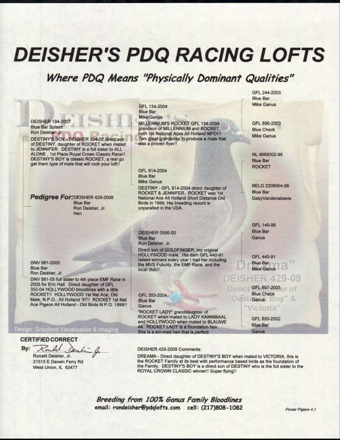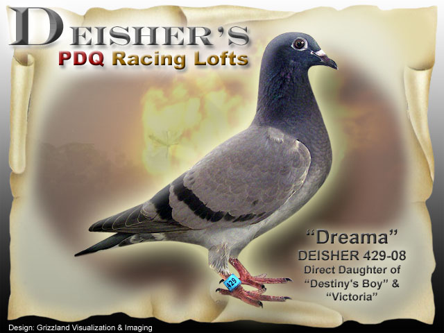 DREAMA - DEISHER 429-2008 - Direct daughter of DESTINY'S BOY when mated to VICTORIA, this is the ROCKET Family at its best with performance based birds as the foundation of the Family. DESTINY'S BOY is a direct son of DESTINY who is the full sister to the ROYAL CROWN CLASSIC winner!! Super flying!!