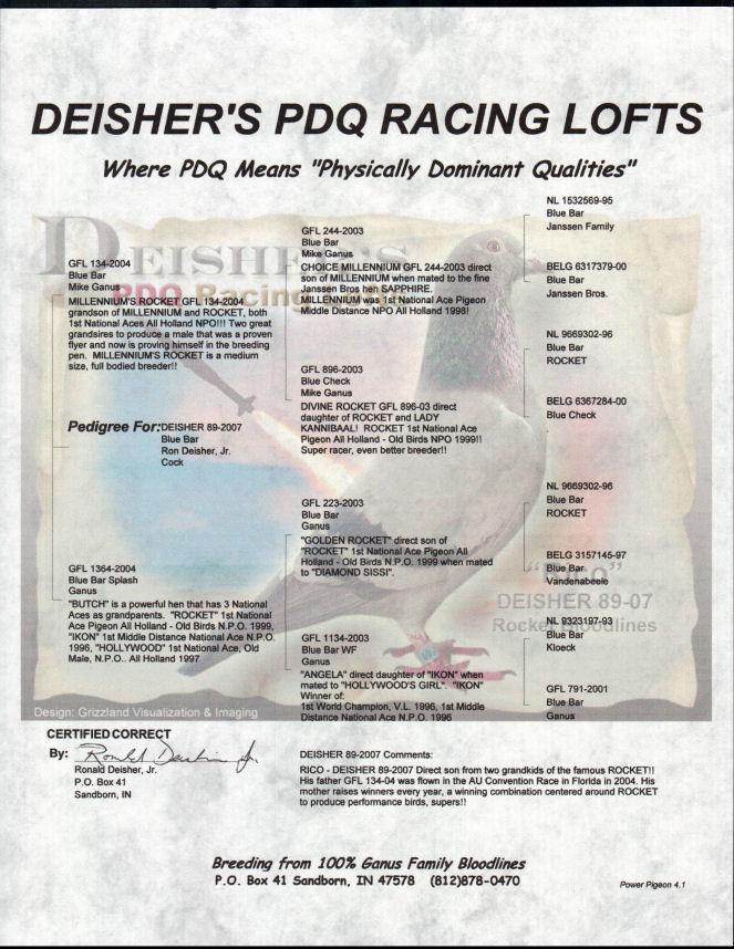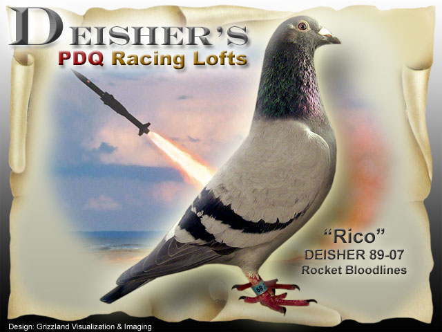 RICO - DEISHER 89-2007 Direct son from two grandkids of the famous ROCKET!! His father GFL 134-04 was flown in the AU Convention Race in Florida in 2004. His mother raises winners every year, a winning combination centered around ROCKET to produce performance birds, supers!!