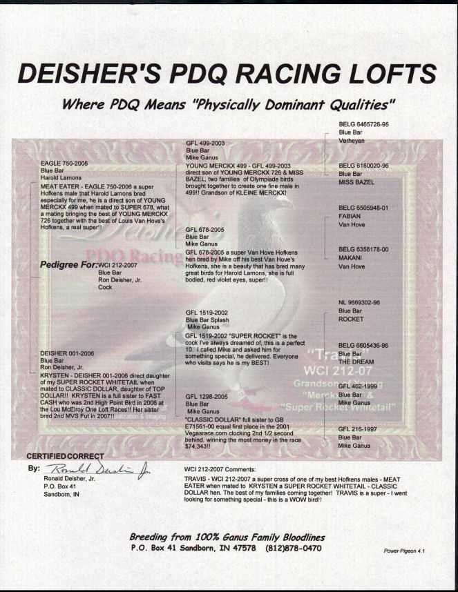 TRAVIS - WCI 212-2007 a super cross of one of Ron's best Hofkens males - MEAT EATER when mated to KRYSTEN a SUPER ROCKET WHITETAIL - CLASSIC DOLLAR hen. The best of Ron's families coming together! TRAVIS is a super, he is a WOW bird!! TRAVIS' father MEAT EATER is one of the most protective males Ron has ever owned, meeting him at the door of his pen ready to take flesh if he move towards his nest, and he has on occassion!! TRAVIS' mother is a full sister to the 2006 2nd Champion Bird, FAST CASH, at the Lou McElroy One Loft Races in North Carolina!!