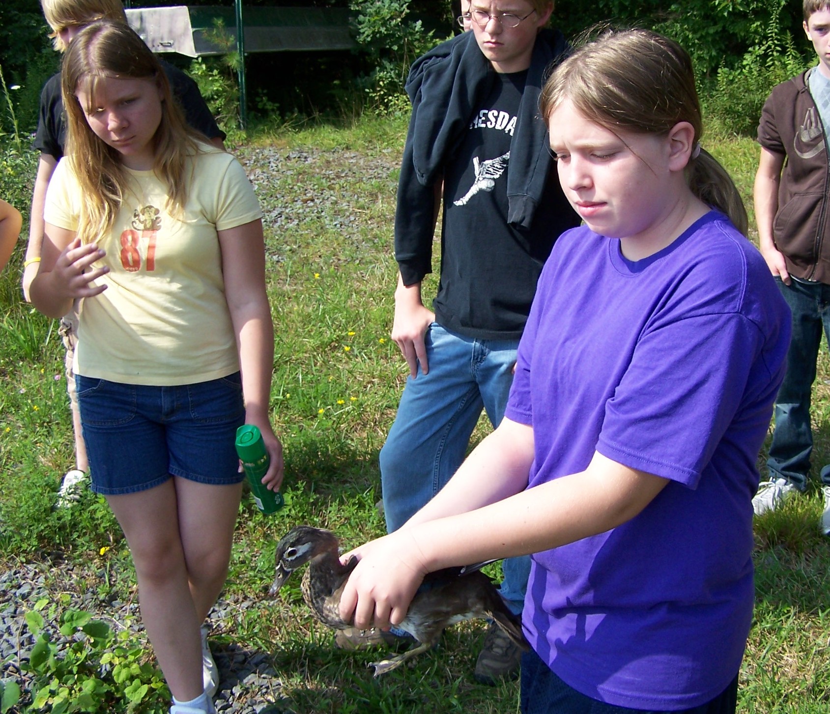 Always a favorite, the students helped the Game Commission band ducks. Here, an immature wood duck is about to get banded (left). Kristen removes a band from the lanyard (center) and Danielle is seen about to release the freshly banded duck (right).