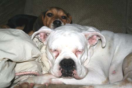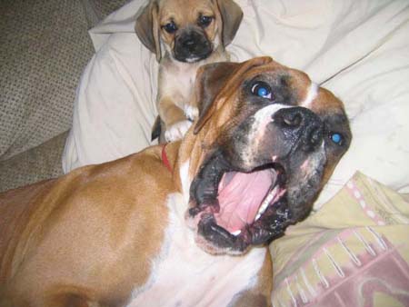 Rocky with a future stud, Otis! Can you believe he's that small and four months old! While Rocky is almost a year and 83 pounds!!
