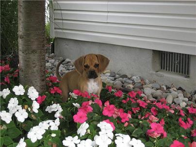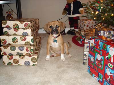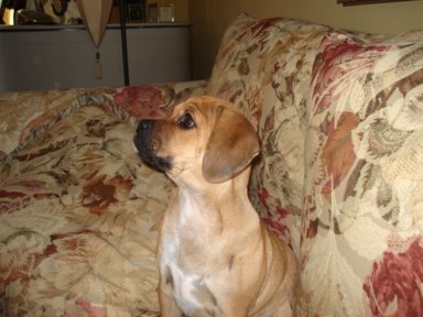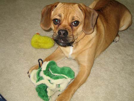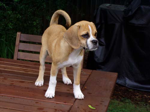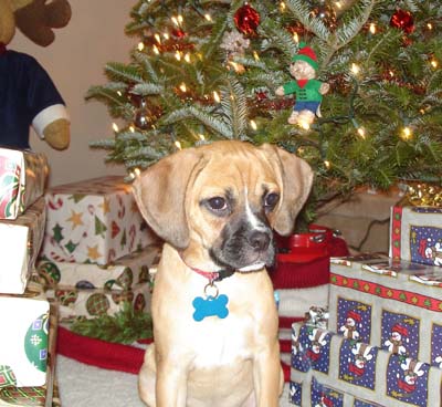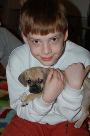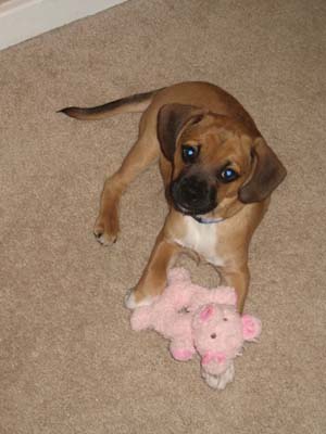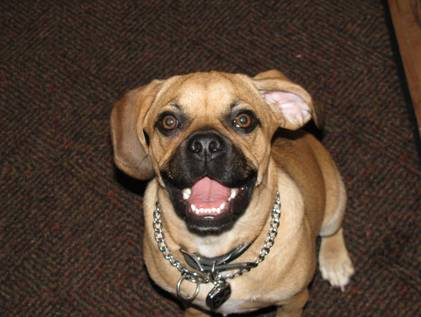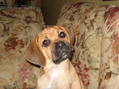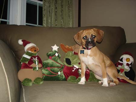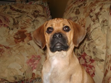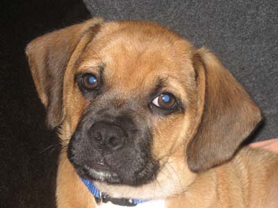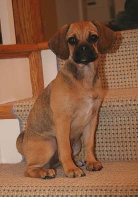 Art, I was planning on sending you an email earlier this week but got sidetracked at work. I've attached some newer pictures of Braxton. He is 6 months old and now weighs 19.5 lbs. He is the most affectionate dog I have ever owned. He loves people so much and gets along great with our other dog Sequoia. He is extremely playful and very smart, but can be stubborn at times. We were able to housebreak him (aside from the occasional accident) within 4 and a half months. He is HIGHLY motivated by food/treats. He has been able to learn some basic commands sit, paw, and lay. Words can't express how happy we are with this little guy. We were very happy to recieve the puggle from you because we knew it came from a reputable breeder and pedigree parentage. thanks again Steve and Jen