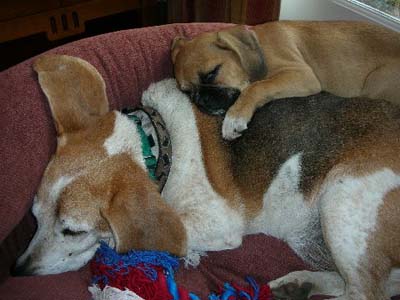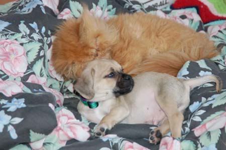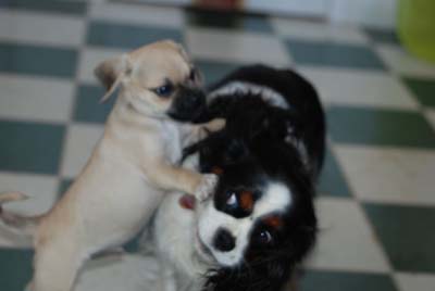 He and Emma, our 2 year old Cavalier King Charles Spaniel are best buddies now. It took her about 10 days to warm up to him, but now she just loves having another dog to play with. It is SO funny to watch them together. They wear each other out, take a nap, and play some more. He tries to nurse her (she’s spayed) and she lets him! It’s so funny. They even talk to each other. Emma makes a cute yodeling noise and Mr. Beans has learned to do it also. One of these days, I’ll record it and send it to you. It’s hilarious!