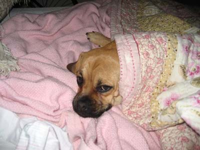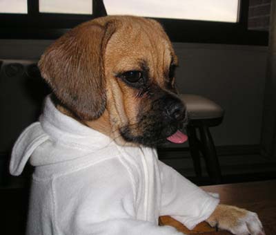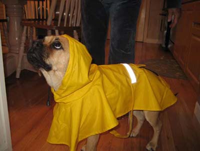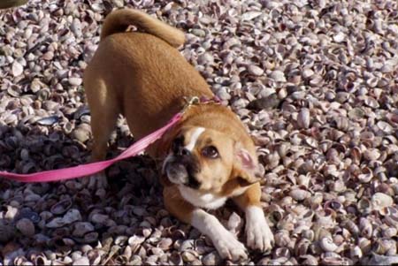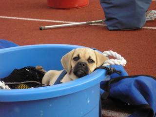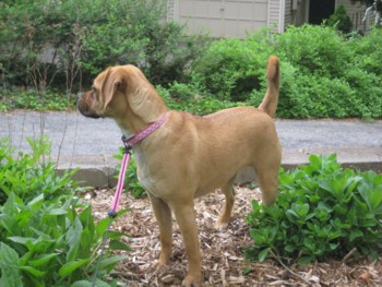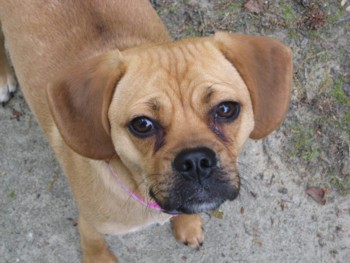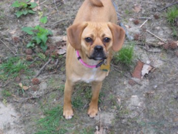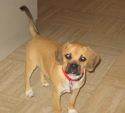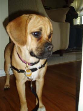We are enjoying our little puggle very much. Our little Chessa is a very happy little girl. And what an appetite! She loves to play with her big brother and sister (our two Labs). She gets a little sad when the kids go off to school though. She looks all over the house for them, and watches the door. Sometimes she comes with me to pick up my son and she gets so excited when she sees all the kids coming out of school. She is totally used to her collar now and she doesn't even mind her ''Lands End all weather jacket''. It even has her name on it. She wen't for