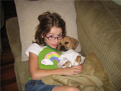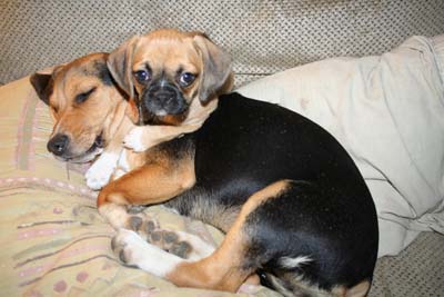 a walk on her leash the other day for the first time. She wouldn't walk so we got her big sister to lead and away she went. She is so cuddly! She just loves to sleep on someone, which is not a problem since we're usually fighting over who gets her. She is sound asleep on my lap as I'm writing this. Anyone could see that she came from a good start in life with the Steffen's. She is bright and healthy and very well-adjusted. And, we were commenting on how clean she was at your place. The other puggles we looked at were dirty and STUNK! And her sweet and