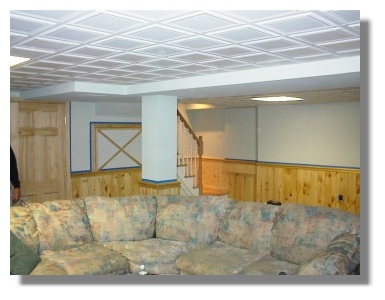 The job presented some major challenges not unlike most basements. Low clearance, duct work, wiring, waste lines and a poorly constructed stairway were problems I faced right from the start. The customers on this project really had great ideas on customizing their basement. A gas fireplace framed on a 45 degree angle (picture #9). The Hearth was specially ordered and cut from Black Granite. I hand picked the mantle, a weathered piece of Poplar from an old saw mill not far from my house.